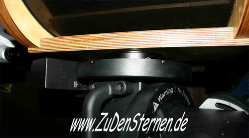 Die 3" Schnell-Kupplung der EQ-8 wurde entfernt (Gewichtsersparnis übrigens 2,2kg) und die 3cm dicke Multiplexschiene direkt mit der EQ-8 verschraubt. Somit erhöht nicht nur die direkte Befestigung der Schiene mit 4 M5 Schrauben die Stabilität. Neben der Gewichtsersparnis rückt auch der Tubus 2,5cm näher an den Schwerpunkt. Ebenso die Gegengewichte. Das reduziert das Schwingungsverhalten: