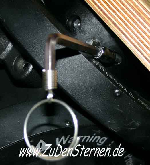 Dieser Hobby-Astronom ist Maschinenbau-Ingenieur und entwickelte per CAD die "Stahl-Spanngurt-Multiplex" Rohrschellen. Gemäß seiner Computer-Berechnung reicht die Stabilität aus. Die geniale Idee daran ist, daß die Schellen unterschiedlich dick sind. Der Multiplex-Teil der Schellen hat 4cm Höhe, die daran verschraubten V2A-Spanngurte - an denen die 3 Schienen problemlos vorbeigleiten können - haben aber nur 1mm: