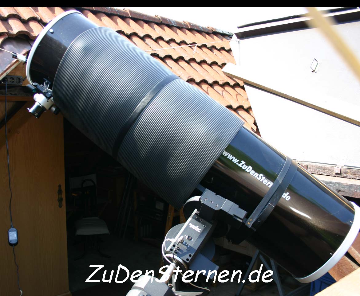 Der 16" Tubus wiegt 32kg, mit Schellen und dem meist verwendeten 2" 28mm UWAN Okular sind das 35kg Gesamtgewicht. Genau die richtige Gewichtsklasse für die EQ-8! In den meisten Positionen kann gut im Stehen beobachtet werden. In Zenitnähe ist die maximale Einblickshöhe von 2 Metern erreicht, somit ist hier ein kleiner Schemel zum Draufstellen notwendig. Ein immenser Vorteil des Flextube ist sein geringer Platzbedarf. Bspw. kann erst in eingefahrenem Zustand die Gartensternwarte problemlos geschlossen werden (rechtes Bild). Der Tubus zeigt nach unten, so erledigt die Schwerkraft das Öffnen des Flextube: