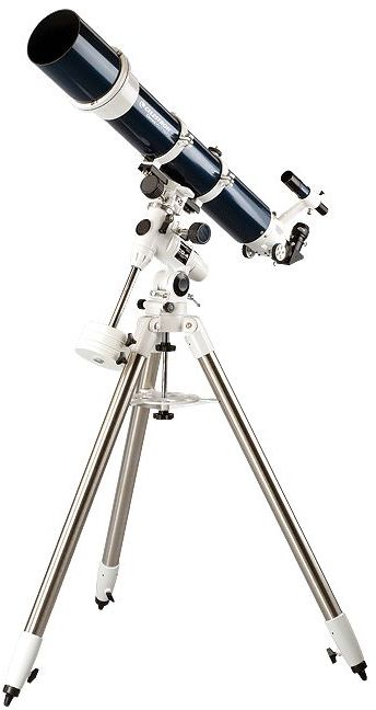 Das Lichtsammelvermögen dieses Teleskops ist etwa 40% höher, als bei dem 102mm Refraktor. Dementsprechend tiefer können Sie auch ins Weltall vordringen. Die NEQ-5 Montierung trägt den Refraktor stabil und lässt sich mit einer Zwei-Achsen-Steuerung sowie einem Polsucher nachrüsten. Der Farbfehler ist mit f/8 erkennbar! Weitere Infos. Komplettgerät mit 2 Okularen und einem 9*50-Sucher für nur 929 €inkl. Sonnenfilter (Wert 39 €) ! Teleskop mit GoTo Steuerung: 1289 € |